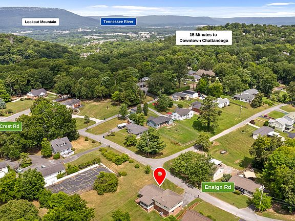 Discover this 3 bedroom, 2 full bath charmer 10 minutes from downtown Chattanooga! Seeking your first home purchase or investment property? Opportunity awaits at 107 Ensign Road. With a split level layout, traditionally defined rooms help to create multiple cozy spaces. Enjoy everyday living or entertain with purpose. Enter into the front living room with spacious windows and original hardwood floors. This room flows into the den for even more living space near the bright and inviting eat-in kitchen. Primary bedroom with ensuite bathroom and walk-in closet offers residents a retreat. Additional 2 bedrooms and a full bathroom are located along the main hall of the home.
