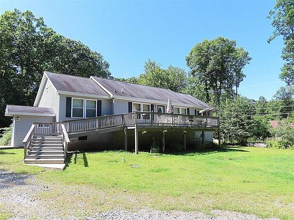 DOUBLE DIPPER DESIRABLE LOCATION for CLOSE TO LAKE Wallenpaupack Water Play, NOT IN A COMMUNITY and possible IN-HOME Business space for you to design. Main level floor plan Ranch with detached 3 bay garage has easy double deck ramp access entrances plus separate private entrance to lower level that can be location for in-home office space or hobby rooms that was used as a family room with parent child quarters. 2 full kitchens, 3-4 bedrooms with all having walk in closets, 3 baths, dining room, blue stone propane fireplace in living room with built in bookcases, Central air condition and ceiling fans, propane hot air heating, circular driveway. Wallenpaupack Area School District. Great for NEW BEGINNINGS