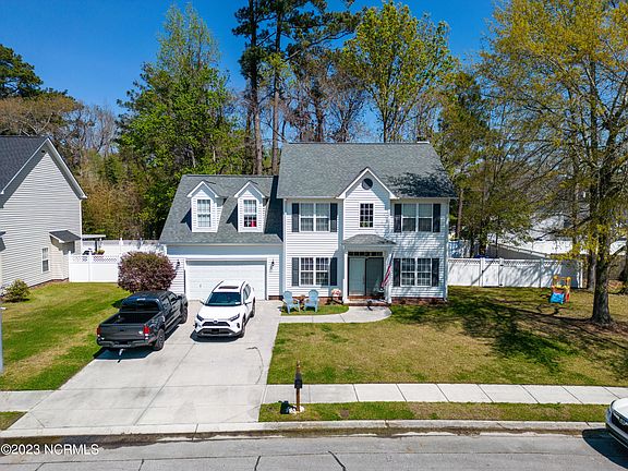 This home is UPGRADED; it is a spacious 4-bedroom home with two full bathrooms upstairs and one-half bathroom downstairs. As you enter the double entry front doors into the foyer, you are greeted by a formal living room or flex room with bi-fold doors on one side and a formal dining room on the other. Just down the hall, the cozy family room with a wood burning fireplace and updated shiplap above is a perfect place to gather and entertain. The family room is just off the eat-in kitchen, with natural lighting overlooking the backyard. The kitchen has plenty of cabinet space, stainless steel appliances, a refrigerator, granite countertops, and a pantry. The laundry room includes the washer, dryer, and cabinets, updated with shiplap. The storage in this home is a huge plus. All the bedrooms are on the second floor. The owner's suite has tray ceilings and granite countertops with double vanities, a private water closet, a soaker tub with a separate shower, and a walk-in closet. The other three bedrooms are nice sized as well. The home has ceiling fans for those hot summer days in all the bedrooms. Enjoy the expansive rear deck, landscaping, mature trees, and vinyl-fenced-in backyard. Within a short distance of shopping, schools, restaurants, Camp Lejeune, Camp Johnson, and MCAS New River! Close to local beaches. This beautiful home waits for you within 40 miles of Topsail Beach and 30 miles of Emerald Isle Beach! Call and schedule your showing today!