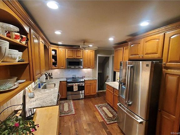 This 'Hidden Gem' is located on quiet cul de sac yet convenient to everything! This spacious updated split level overlooks protected marshland at the end of the cul de sac. Enjoy sunrise over the marsh grasses out the Living room's bow window. Handsome engineered wood floors thruout the first floor. Plus there's an attractive enamel pellet stove built into the fireplace for added warmth. LR is adjacent to dining area with new sliding doors to large deck. Enjoy the bowl-shaped fenced-in yard with lots of room for perennial gardens and trees. Back inside, the beautiful remodeled galley kitchen beckons with upgraded 48" wood cabinetry and stainless appliances. Up a few steps is the hall bath & 3 spacious BRs. The master BR also has an updated shower bath. The finished lower level Family Room features wood burning stove and tiled floors. Plus half-bath and Laundry room. 2-car garage addition. CT Basement System inplace in stoarage area of basement only. Don't wait-- This spacious updated home checks all the boxes! Seller will be removing/taking shed