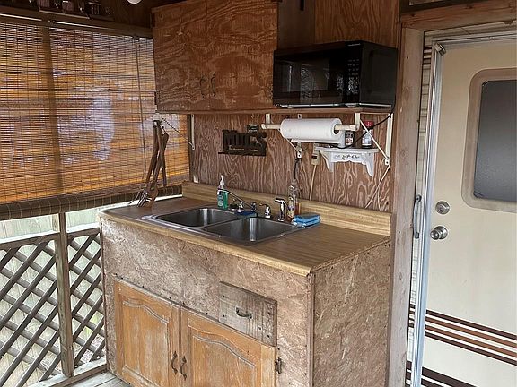 This 2 bedroom, 1 bath unit has fresh updates and is ready for you to come for the summer. Nice size lot with plenty of parking. The camper has fresh paint, flooring, new LED lights, new shower, real potty and vanity. Each room has a barn door for privacy. Furniture to remain (except Grandmas rocking chairs on porch). There is a kitchenette on the porch with refrigerator, sink and microwave. Great storage throughout. Come and see if this is your happy place. Clients must be with an agent to access the community.