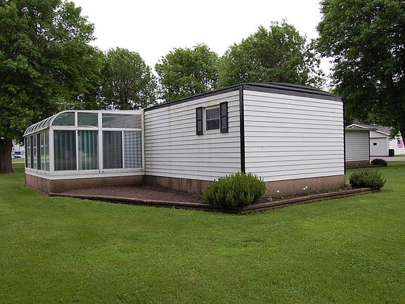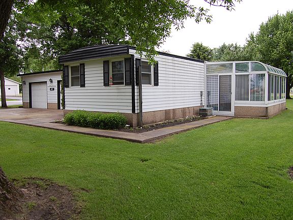 14' x 62' 1975 Trailer Home on beautiful double lot with 16' x 20' glass patio and attached 2-stall garage. Comes fully furnished with optional add-on package of 60" cut Grasshopper lawn mower, Cub Cadet utility vehicle, and Toro snowblower.