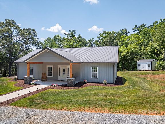 Custom-built, one-owner 3BR/2BA home on 4.57 private, beautifully landscaped acres in Rutherfordton. Features open floor plan with walnut and tile flooring, 10’+ ceilings, and split-bedroom layout. Spacious primary suite offers walnut floors, tile shower, and private patio access. Additional bedrooms share a tiled bath with walk-in shower. No-step entry, covered front and back porches, and detached storage building add convenience. Built for low maintenance with metal roof and siding, 8” exterior walls, and interior soundproof insulation. Quality construction throughout with thoughtful upgrades. Detailed upgrade list available upon request. A peaceful, private retreat just minutes from town—move-in ready!