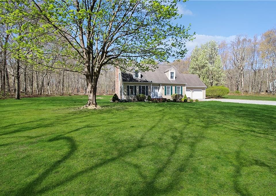 Welcome to this beautifully maintained Cape nestled on 4.94 serene acres, offering the perfect blend of charm, space, and privacy. Boasting over 2,100 square feet, this home is surrounded by trees that create a peaceful outdoor retreat, especially from the expansive, meticulously landscaped patio with stone wall-ideal for enjoying the beauty of every season. Step inside to a warm and inviting living room featuring a classic brick fireplace-perfect for cozy New England evenings. The space flows effortlessly into the kitchen equipped with stainless steel appliances, opening into a sunlit dining area ideal for family gatherings and entertaining. Just off the dining room, you'll find a convenient laundry area and a half bath. The main level also includes another versatile room that can be used as a den or office. Upstairs, hosts a spacious primary bedroom with an ensuite bathroom, two additional generously sized bedrooms and another full bathroom. Additional highlights include a two-car attached garage, new windows, central vacuum, basketball court and low-maintenance vinyl siding. Located just minutes from I-95, casinos, and the scenic shoreline. This move-in-ready home offers the perfect balance of country tranquility and modern convenience.