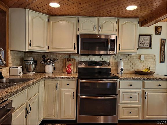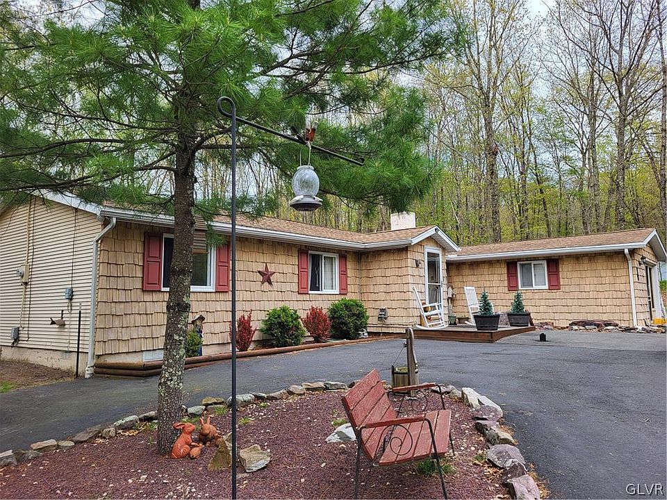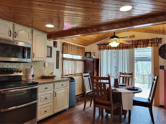 Escape to your slice of mountain paradise in this cozy retreat nestled among the pines. Designed with comfort in mind, this home boasts rustic charm blended seamlessly with modern amenities. The updated kitchen accented with a wood plank cathedral ceiling and stainless appliances is flanked by a cozy living room with a stone, wood burning fireplace, a large family room for gaming and a bright and cheery 4 season sunroom. This sociable area opens to a spacious multi level deck with gazebo & nature views. 2 spacious bedrooms & a beautifully renovated bath with tile surround jetted tub & rain shower complete the floor plan.1 car garage, carport, & 2 sheds to store your gear! Whether you're seeking a peaceful getaway or an outdoor enthusiast's dream, Hunter Ln offers it all. Perfect for a short term vacation rental. Within walking distance to 2 out of 5 lakes. Located within a gated community with 2 pools & clubhouse. Mins to Jim Thorpe, Skiing & State Game Lands Furniture & TVs included