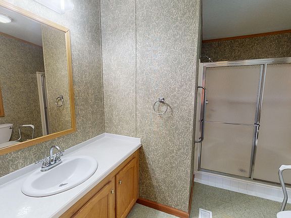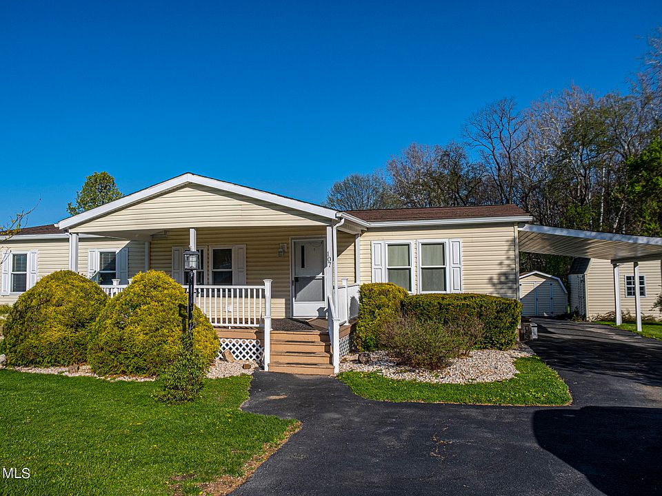 A 55 + plus community. Well maintained Doublewide located on a corner lot. Features are a large eat in kitchen with laundry room. Three large bedrooms with one being its own master suite with walk in closet and master bath. A bonus room could be an extra bedroom or office.This home boasts a nice yard and 2 porches with the back porch being totally enclosed . Also a huge workshop shed with electric. Schedule a tour.