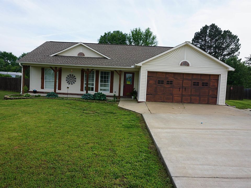 Very nice house in a great location just 2 minutes off the exit in Judsonia and only 10 minutes from Searcy. House is updated and has no carpet. Laminate and tile floors throughout. Split floor plan with open living room and kitchen dining room combo. Kitchen has tons of updated cabinets and a nice pantry for more storage. Stainless refrigerator with bottom freezer will stay. Both bedrooms have nice closets and the primary bedroom has a walk in closet and a nice full bathroom. Main bathroom has a tub shower unit. There is a Family Safe installed in the garage and bolted to the floor and also a workbench. The water heater was replaced and is in the storage room in the garage. The back yard is huge and has a large covered back patio. There is a large metal carport with a concrete pad in the privacy fenced back yard. Roof was put on in 2021. The front porch is super cute and has cedar posts and cedar shutters.