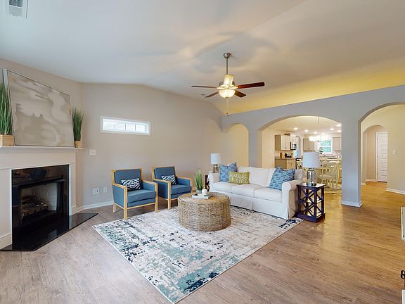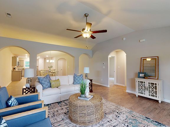 The Kids plan, as part of our Carolina Series, is uniquely designed so it can accommodate four different variations of the layout! This is the 2 car with bonus options, with the same base interior as all other Kids plans except built with a two car garage and additional square footage of bonus room space behind the garage and with connection to your kitchen. When you walk in the front door you will be greeted by a cozy living room with views out the front of the home and onto the expansive front covered porch. As you move through the home, the spare bedrooms and guest bathroom will be located just off the living room, there is a strategic separating archway between the living and dining to define the spaces accordingly, through the dining room you will see the kitchen with tons of counter top space and eat at bar-top section, then in this variation there will be a door way off the kitchen that leads to your bonus room with windows across the back to enjoy your backyard and lots of natural light! Also off the dining room is your owner's suite hallway that contains a coat closet and laundry closet for convenient access to the owner's bedroom with walk-in closet and spacious bathroom. The Mill community features will include a propane gas fireplace in the living room, garage service door, and even dual vanities in owner's bath. 107 Kettle Drive will include the luxury choice option of a rear covered porch!