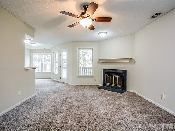 This Cary one-story offers a wood-burning fireplace. Trash and recycling pick up and community pool access are part of the Chesapeake Landing HOA.