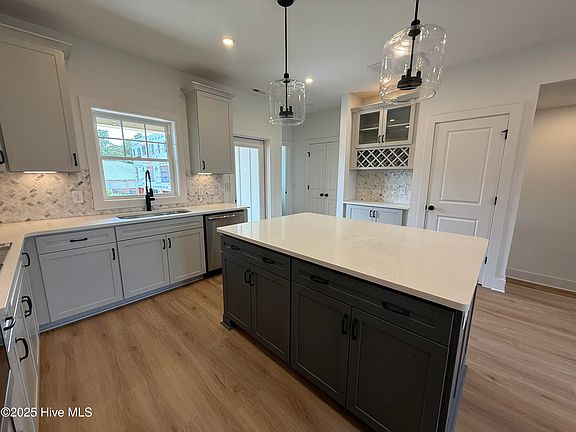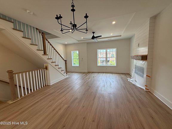 Step inside and on the first floor you can enjoy a first floor bedroom, drop zone, full bathroom, and entry to your garage. Moving to the second floor of the home you will find an open concept living room, kitchen, and dining area. The living room includes upgraded features such as a trey ceiling. The kitchen includes a large kitchen island that serves as an additional eating space. Off the kitchen is a beautiful covered porch another unique and luxury design feature for these one of a kid townhomes. This space is perfect for entertaining, enjoying the North Carolina Seasons, or taking in the sights and sounds of the vibrant Downtown Southern Pines. Other second floor features include a pantry, coat closet, and half bathroom.