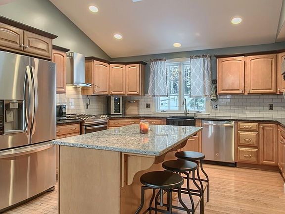 - Kit Dscrp: Flooring - Wood, Skylight, Ceiling - Cathedral, Kitchen Island, Recessed Lighting, Remodeled