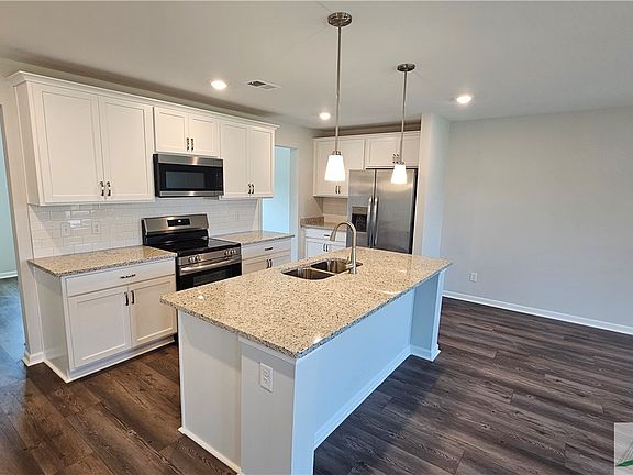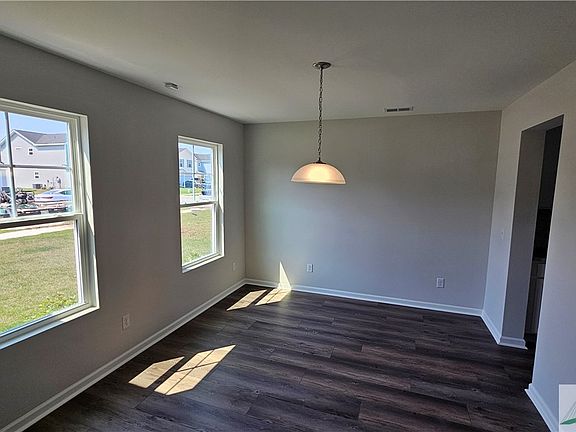 Savannah's most trusted local builder is proud to offer our Grayson TR plan. This home has some excellent features and upgrades including a separate garden tub and separate shower in the primary bathroom, quartz tops in all full bathrooms, upgraded 12' x 12' back patio, garage door opener with 2 remotes, pendant lights above the kitchen island, click plank wood look flooring all downstairs and all wet areas as well, ADT security system, 36" upper cabinetry upgrade in kitchen with hardware, granite tops with tile backsplash in kitchen, all stainless appliances including the fridge and microwave in kitchen, framed mirrors in all bathrooms, and fully sodded and irrigated yard with automatic timer. Home is Finished Now. Pictures, features, and selections shown are for illustration purposes and may vary from the actual home built. All builder incentives applied.