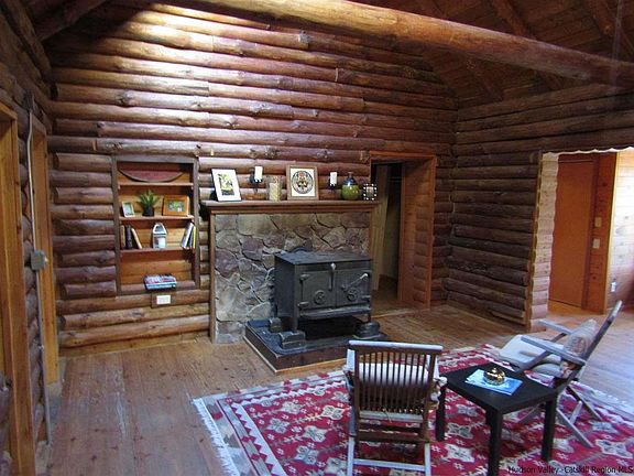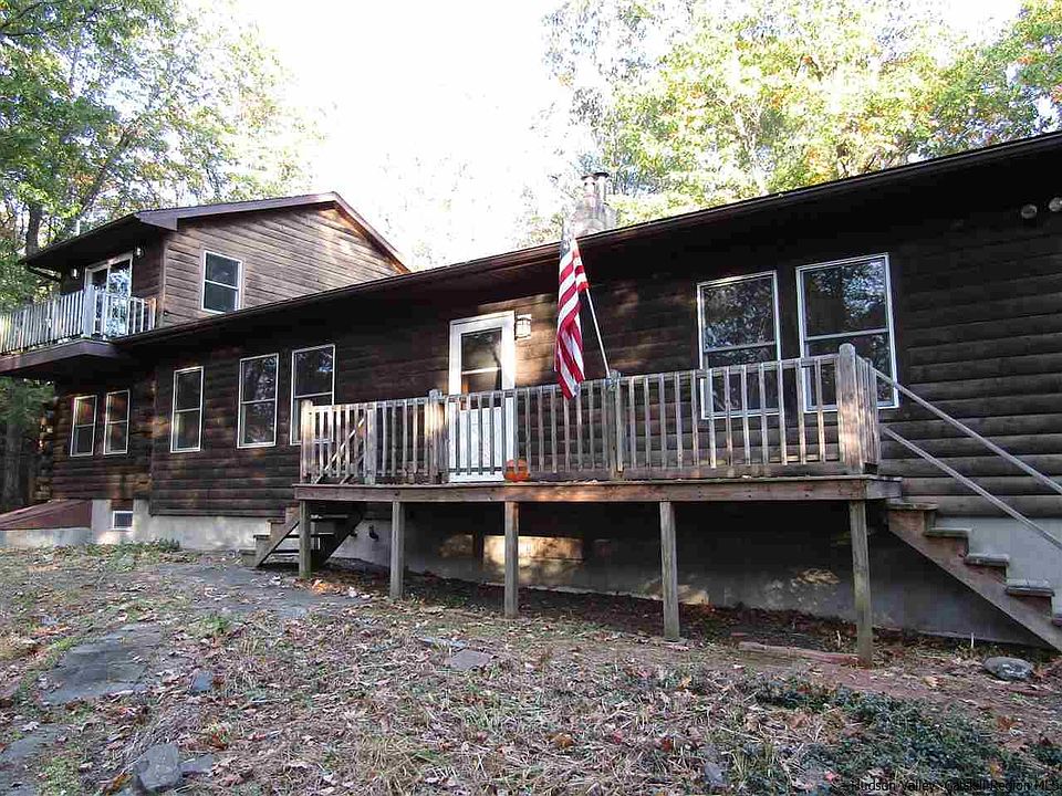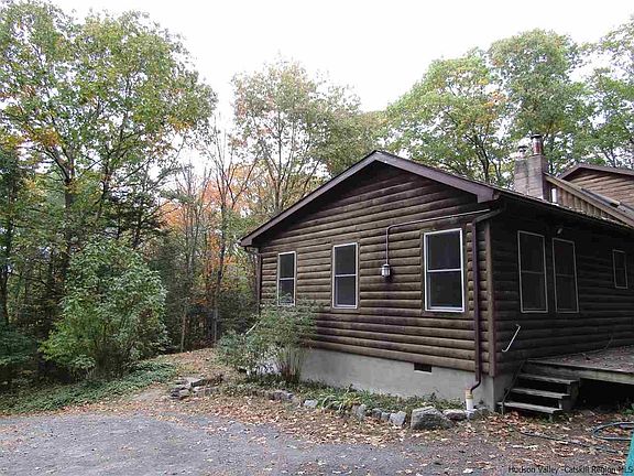 Tucked away in a secluded country setting, this sweet 3 BR log home is set in a serene wooded setting, filled with warmth and charm. With a beamed cathedral ceiling, skylights, the cozy living room has a woodstove, built in bookcases, and a loft area. There is a half bath, and space for laundry area off the living room. A seating area is off the main living area, with built in storage under, that would be a perfect corner to curl up with a book and gaze out at the woodland. The dining area has a built in upper cabinet, and the galley style, all wood kitchen features a wet bar, and lots of storage and cabinetry. Enclosed screened porch directly off the kitchen area, to the rear of the house. 2 main floor sunny bedrooms, with lots of closets and storage space throughout. Upstairs, there is a small sitting area great for a desk or library that leads to a sunny wood paneled bedroom with a balcony facing the seasonal mountain views. Full sized full basement has abundance of storage. 2 sheds on property, one is larger and could be fashioned into a outdoor workspace, or playhouse. The other shed is open, and could be a great place to store wood. The property is privately sited, and is a short distance for easy access to Rt 32, to village of Saugerties, and the Thruway. This is a hidden gem!
