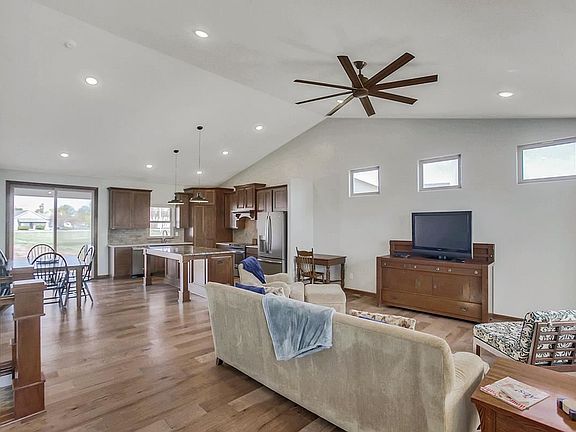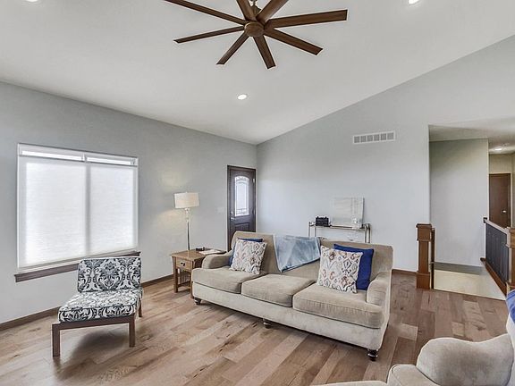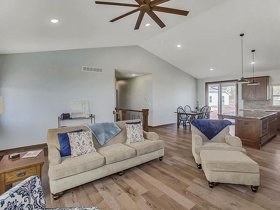 Small town living at its best! Gorgeous 4bdrm/3bath home located on a corner lot in the lovely Pretty Flowers Estates in Garden Plain. Easy access to the highway (400) and only 15 minutes west of Wichita. Front door opens to a very large room that houses the kitchen/dining/living room with a vaulted ceiling. Kitchen features beautiful woodwork with a walk-in pantry, built in trash drawer and microwave, and a touch faucet. All plug ins are under the cabinets for a clean backsplash look. Beautiful engineered hardwood floors add beauty to the massive open room. Sink and refrigerator have a working RO system in place for the water. A central vacuum system makes house cleaning so much easier. All window treatments are cordless shades and both top and bottom can move up and down. Large Master Bedroom has a dark wood "barn door" for Master Bathroom. Master walk-in closet has a 10 ft. ceiling to allow 3 levels of hanging for clothes. Large window in basement Family Room has a granite top window seat. Basement walls are insulated. Laundry is a finished room in the basement. Furnace and AC is a heat pump system and home is all electric. Oversized 3 car garage offers a large area of storage and a shop. Easy access from kitchen to covered patio makes entertaining guests very easy to do. Sidewalk access all around the house. Yard contains a well for a future sprinkler system. Don't miss seeing this beautiful home! Book your showing now! The Pretty Flowers Estates provides a large pond and a private swimming pool for the residents to enjoy. Don't miss seeing this beautiful home! Book your showing now!