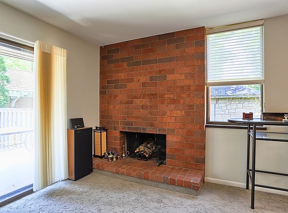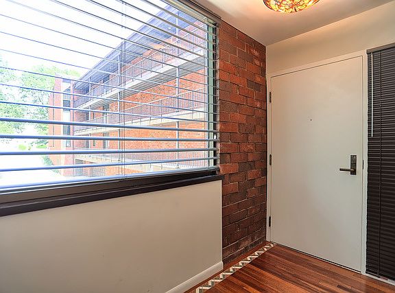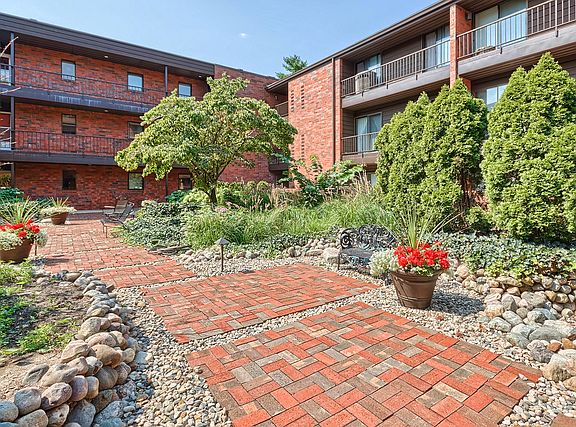 Very nice first floor unit on West side of building. Hardwood kitchen and hallways with tile insets. Solid surface kitchen counter-tops, newer cabinetry. Exceptionally large Master Bedroom w doors to covered patio. Unit offers windows on three sides for wonderful light. Beautiful brick fireplace. Well-maintained condo association, on-site manager, heated garage, 2 elevators, beautiful commons courtyard and just a block from city's center and next to West Side Park.