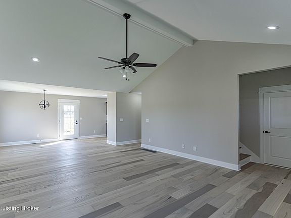 Welcome to this adorable all brick 1 1/2 story home. Great location, only 4 miles to the city of Bardstown and 12 miles to I65. As you enter the front door, you'll find the open great room with a vaulted ceiling that opens to the dining area and Kitchen. The Laundry Room is conveniently located on the first floor near the Primary Bedroom. Nice size primary bedroom with walk-in closet and private bathroom with tile flooring. Beautiful, engineered hardwood throughout first floor. 2 bedrooms upstairs with full bath. Lots of natural light throughout home. Walk out from the dining area to a huge 14X14 deck and a large 18X14 concrete patio below. There is a green space behind home. 20' easement, also a 55'x212' green space area.
