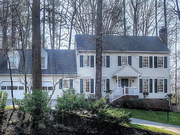 This lovely custom home sits on a .39 acre landscaped lot near greenway trails & a community lake. Located on a pleasant no-outlet street, it features a spacious updated Kitchen with Schuler cabinetry, granite countertops, large island, tile backsplash & walk-in pantry. Matching appliances convey. A bright bay window illuminates the Breakfast Room, which overlooks a large deck and level wooded back yard. Hardwood floors & custom trim grace the Foyer and Dining Room, and crown & chair rail continue throughout the Family Room with masonry fireplace and french doors leafing out to a beautiful screened porch. A large hallway contains the Laundry and Half Bath & leads to a double garage with an additional storage room. Upstairs, the roomy Master Bedroom features a new ceiling fan & bright walk-in closet, and adjoins a Master Bath with whirlpool tub, double sinks, separate tiled shower, and large picture window. Two additional bedrooms with walk-in closets and permanent shelving are down the hall, as is a recently remodeled Full Bath with tile floor and bonus room. The huge Bonus is great for relaxing or play, with 2 dormers w/window seats, built-in speakers (which convey) a wet bar, & windows overlooking the back yard. A second staircase leads downstairs. Well-maintained and priced to sell, other features include fiber cement siding, all new windows, new HVAC duct system, new windows, and beautiful new screen porch and deck. Walk to neighborhood pool, tennis, playground & Bond Park. This home is located in Normandale, a small neighborhood of custom homes on the east side of Lake Hoffman in Oxxford Hunt - just a short walk to fishing, canoeing and wildlife watching - all in the heart of Cary! Normandale Drive is a quiet cul-de-sac street where many owners have recently remodeled or added on. Along with proximity to lake and trails, amenities include a large community swimming pool (with a diving board & 2 lifeguards), remodeled playground, resurfaced tennis courts, and clubhouse.