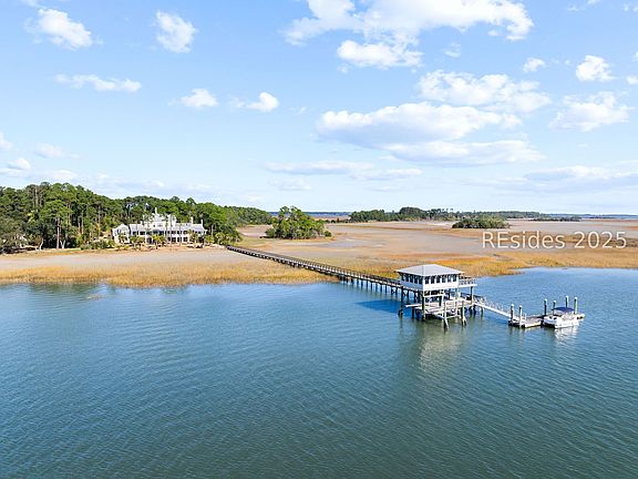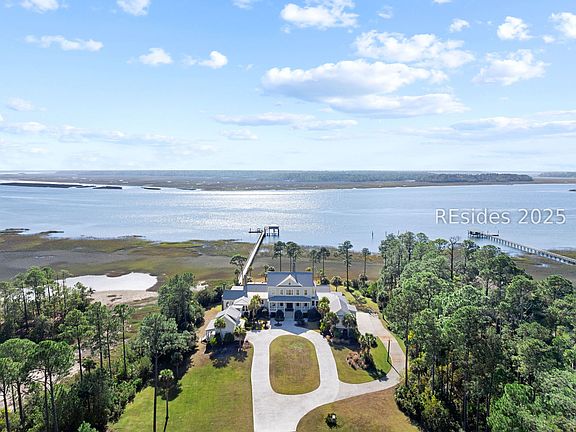 Experience the soul of Lowcountry living in this enchanting deep-water estate, where timeless Southern charm meets exceptional craftsmanship. A sweeping wraparound porch captures gentle river breezes and sets the stage for unforgettable sunrises and slow, breezy afternoons. Inside, soaring vaulted ceilings, abundant natural light, and warm, inviting finishes create an atmosphere of effortless elegance. The gourmet kitchen is perfect for gatherings, offering refined style and functionality. A spacious mother-in-law and beautifully appointed detached carriage house provide unmatched flexibility for guests or extended family. The oversized 4+ garage and generous walk out storage-with bathrooms-ensure space for every hobby, project, and coastal toy. A rare 4-stop elevator adds ease to daily living. On the river, a private deep-water dock awaits with an impressive 18,000 lb lift and a covered perch above the water-an idyllic spot to relax, unwind, and savor the beauty of the Lowcountry. Thoughtfully wired for a whole home generator, this estate blends comfort, luxury, and Southern grace in every detail.