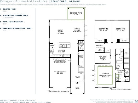 Situated in desirable Goose Creek, Hawthorne Landing offers an idyllic location that's brimming with small-town character and puts luxury within reach. The kitchen is truly the heart of the home in the beautiful Rosa home design. A long, elegant foyer reveals the Rosa' spacious great room and casual dining. The well-designed kitchen has a large center island with breakfast bar, wraparound counter and cabinets. The primary bedroom suite is highlighted by an impressive walk-in closet. Secondary bedrooms feature sizable closets. An oversized garage is complemented by dual exterior storage areas with lighting and electrical power. Yard maintenance and irrigation included in the low HOA.