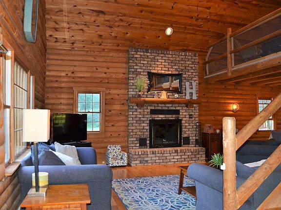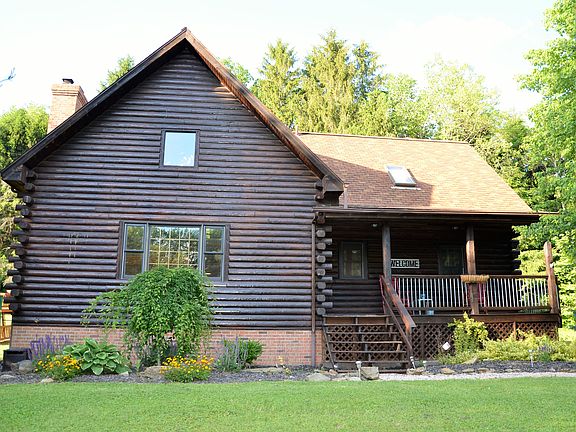 A stunning rustic-modern log home that emphasizes luxurious indoor and outdoor living! Mature lavish landscaping greets one curbside along with an extended 2 car garage driveway and a covered front porch. Upon entry, there are gleaming hardwood floors that sweep through the open floor plan. Spacious living room boasts a wood-burning brick fireplace, a cathedral ceiling and plenty of windows that allow continuing daylight to flow throughout the house. The dining area has French doors that lead to an extensive deck that features private picturesque views, a pergola, a swing and a substantial amount of entertainment space. Modernized kitchen contains granite countertops, stainless steel appliances, mosaic stainless steel backsplash and elegant pendant lighting. Main level also contains 2 bedrooms with generous closets and a full tub/shower combo. Ascending upstairs there is an oversized loft with an all-encompassing view of the main level, an updated full bath and a large master bedroom with a skylight. Lower level laundry room provides an abundant amount of storage space and a family room with a wood burner hook-up. The tranquility of this 1.82 acre lot and character of the interior and exterior spaces makes this exquisite log home a must see. For more information, call The Michele Frederick Team at 724.506.6114.