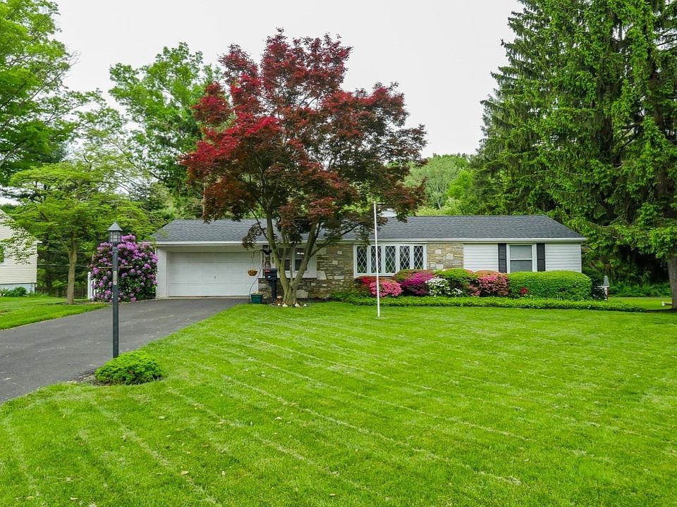Charming three bedroom ranch located on a quiet street with mature landscaping and private yard. Large living room & dining room with stone fireplace with pellet stove. Gleaming hardwood floors and many custom woodworking details throughout. Nicely sized kitchen with an abundance of cabinets. Large sunroom offers many possibilities for enjoyment. Three nice sized bedrooms with hardwood floors and full bath complete the main level. New roof, heat pump, and AC. Newer windows and freshly painted throughout. Finished basement with designer stamped concrete flooring, bilco doors, full bath, laundry area and workshop offers extra living & storage space. Two car garage and oversized driveway. Mature manicured landscaping, lush lawn and bluestone patio for your outdoor enjoyment. Excellent value and Pennsbury Schools!