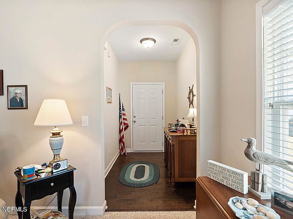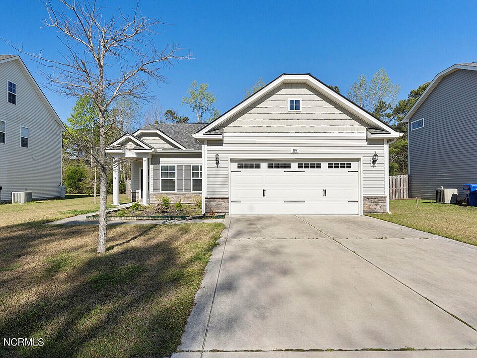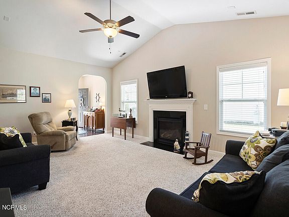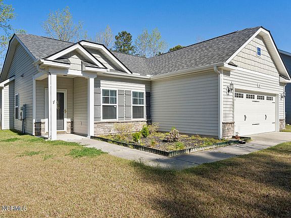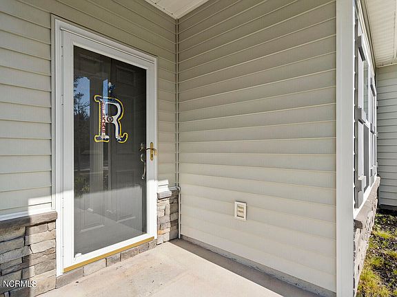 Enjoy beach community living with the benefit of being in the Topsail schools district in the highly desired Poplar Branch Community. This Haywood floorplan is a one owner home and is a beautiful 1-story plan that features 9' ceilings throughout, granite counters, tile backsplash, and stainless steel appliances in the kitchen, an off-kitchen Master Suite gives lots of privacy while overlooking the backyard. The home also has a gas fireplace, living room that is pre-wired for television and surround sound, a 2 car garage, and a covered patio. The backyard is great for entertaining as it has a screened in porch and a nice yard for the kids and pups to run around all while enclosed with a 6ft privacy fence.