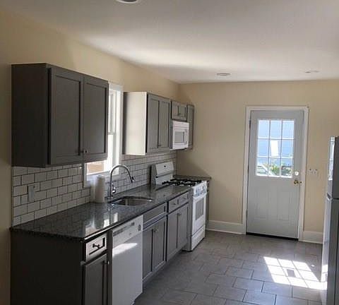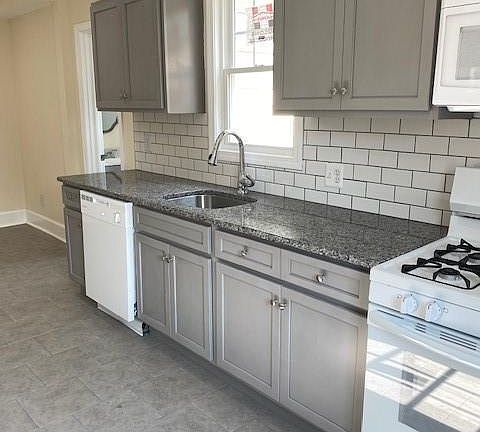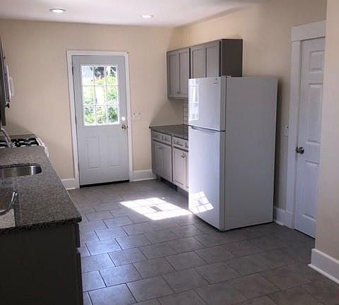 This is one of two FABULOUS units in a two family home, freshly remodeled from top to bottom! This FIRST FLOOR dream rental feels like new construction! Located on an attractive street with sidewalks close to town, this unit features a brand new sharp, modern kitchen with granite countertops, recessed lighting, new appliances, tile floor and a spacious eating area. Off the kitchen is the remodeled bathroom. Two good sized bedrooms with ample closet space and new ceiling fans, and a living room make up the rest of the unit - all featuring gleaming hardwood floors. Accessed from the kitchen is the dry basement which offers a large (14 feet by 9 feet) secure storage area and brand new energy efficient washer and dryer, all designated FOR THIS UNIT ONLY. One SECURELY DIVIDED half of the two car detached garage goes with this unit, plus one spot in the driveway for off street parking. Tenants share the large, level yard. Gas heat and city water and sewer. Final finishes are being done now, with the anticipation of occupancy availability of October 19th. Security deposit, credit check, landlord references. No pets, no smoking. Square footage approximate.