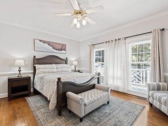 Step inside this beautifully maintained home in the coveted Williamsburg Commons community, where timeless style meets modern comfort. As you enter this stunning home, you'll be greeted by a beautifully designed staircase and the attention to detail everywhere—from extensive crown molding and wainscoting to custom built-ins and classic trim work, all giving each room a refined, finished look. The first-floor primary suite is a true retreat, complete with a spacious cedar-lined walk-in closet, private access to the back deck, and a well-appointed en-suite bath. The main level flows seamlessly from a formal dining room with elegant trim details to a beautiful living room with a gas fireplace and custom shelving, perfect for entertaining or everyday living, to an eat-in kitchen with stainless steel appliances, induction range, double ovens, and plenty of storage. Upstairs, two generously sized bedrooms and a full bath provide ample space for family or guests, while an additional 273 sq ft above the detached two-car garage with covered brick walkway offers endless potential—ideal for a home office, gym, or creative studio. Throughout the main floor, you'll find heart pine hardwood floors, plantation shutters, and an abundance of natural light. The home has been exceptionally maintained, with updates, including fresh interior and exterior paint, a new HVAC system, and a sealed crawlspace for added peace of mind. Outside, enjoy the private brick courtyard with newly-installed fence. The large deck is perfect for morning coffee, evening gatherings, and entertainment. The low-maintenance yard, cared for by the HOA, make outdoor living easy and enjoyable. Williamsburg Commons is known for its tree-lined streets, charming and unique curb appeal, and unbeatable Cary location. Lochmere Golf Club, greenway trails, and a city maintained park are within walking distance. Close by are shopping, dining, a hospital and medical offices, a lakeside Amphitheater featuring symphony and well known musical performances, the new and nationally acclaimed Cary Downtown Park and major highways providing quick access to Raleigh-Durham International Airport, N.C. State University, and downtown Raleigh, this home combines classic craftsmanship, impeccable upkeep, and everyday convenience in one rare package.