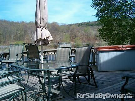 3 Bedroom 1 1/12 bath Brick Chalet with frontage on the Delaware River. Lovely views, great fishing, small grouping of mostly weekend homes. No dues.