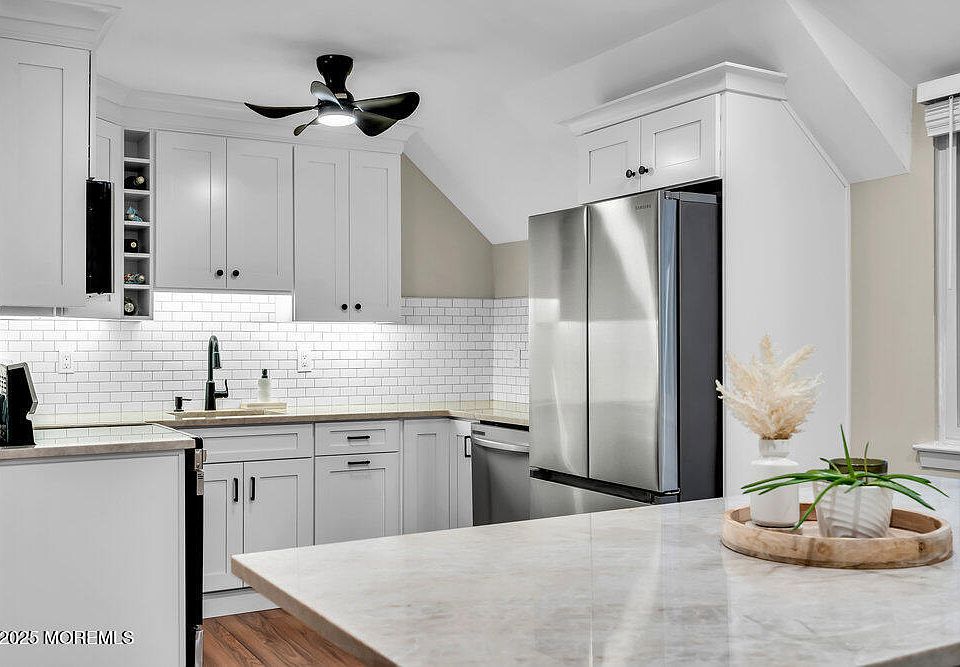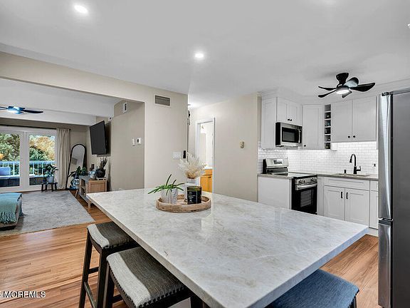 Nestled along the serene Shark River in desirable Neptune City, the charming community of Bijou Villa, offers the perfect blend of coastal living and modern luxury. Step inside to discover a freshly renovated space featuring a brand-new white kitchen with stylish shaker cabinets, quartz countertops, a chic subway tile backsplash, a built-in wine rack, and a center island with seating—all complemented by new brand-new washer and dryer and suite of stainless steel appliances. The home features durable vinyl plank flooring, recessed lighting, and electric cooking, while the living room showcases beautiful hardwood floors, a ceiling fan, and a triple window with a rear slider opening onto your private balcony, offering tranquil water views. A cozy covered porch, a coat closet in the foyer, a cozy covered porch, a coat closet in the foyer, and convenient covered parking has direct access to building from the courtyard level. Beyond your front door, enjoy a vibrant waterfront community complete with private balconies, a pet-friendly policy, a refreshing inground pool, and an exclusive private launch and storage area perfect for your kayaks, canoes, and paddleboards, all within easy reach to the nearby beaches and Memorial Park.