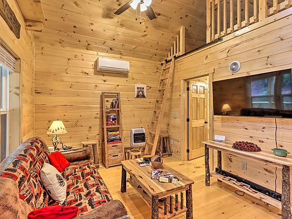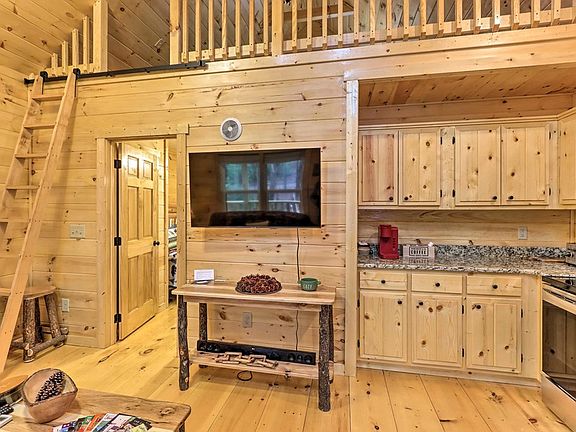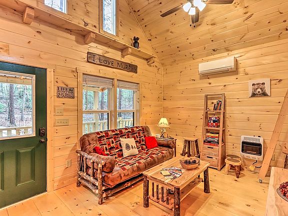 Welcome to 107 Rushmore Ln, Murphy, NC 28906! This charming 1-bedroom, 1-bathroom chalet-style home, built in 2022, offers 396 sq. ft. of cozy living space on a 0.35-acre lot in the serene Whispering Hills community. The home features an open great room, a custom kitchen with granite countertops and custom-built cabinets, a loft area, and a covered front porch perfect for enjoying the peaceful wooded setting. Modern amenities include high-speed fiber optic internet, electric heating and cooling, and a metal roof. With beautiful wood ceilings and walls, this home creates a warm, inviting atmosphere, making it an ideal vacation rental or full-time residence. Don't miss out on this unique opportunity to own a piece of tranquility in Murphy, NC.