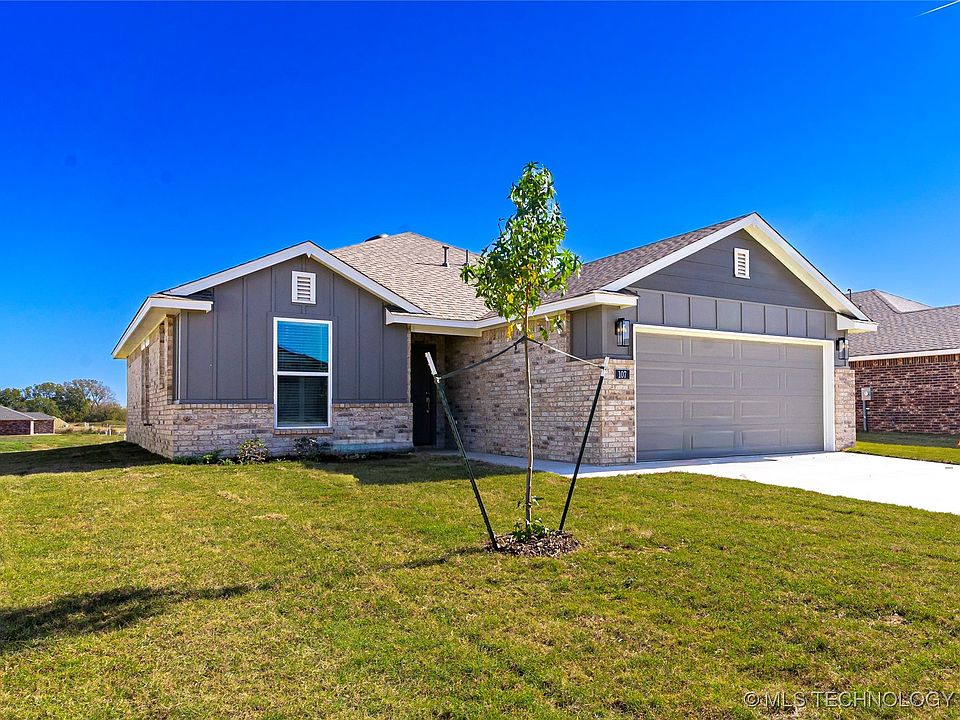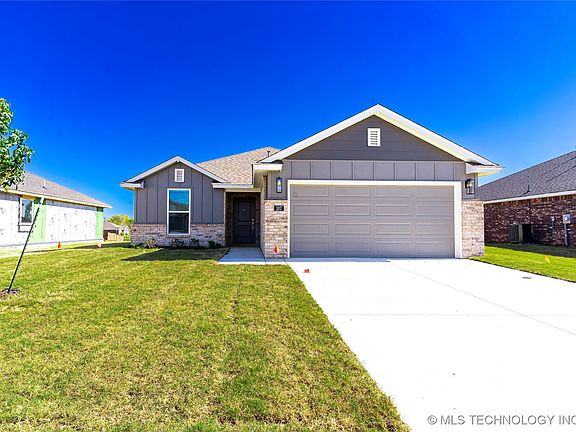 Welcome to the Wilson floor plan by Glenwood Homes, located in the desirable Georgetowne community of Collinsville, OK. This thoughtfully designed single-story home blends style, comfort, and efficiency, making it the perfect choice for anyone looking for a low-maintenance lifestyle in one of the Tulsa metro’s fastest-growing communities. With unmatched included features and $0 down financing options available, there has never been a better time to make your move. Step inside and experience a home where every detail has been carefully considered. The spacious kitchen is a true centerpiece, featuring granite countertops, subway tile backsplash, shaker-style cabinets with hardware, and Samsung stainless steel appliances—including a freestanding gas range, microwave, and dishwasher. An oversized island creates the perfect gathering space for meals, conversations, or entertaining. Bathrooms offer granite vanity tops with undermount bowls, elongated toilets, and a fiberglass shower/tub combo, combining durability with modern finishes. Throughout the home, raised ceilings (per plan), LED lighting, hard-surface flooring in main living areas, two included ceiling fans, and full blinds add comfort and style. Energy-efficient touches like a 96% tankless water heater, R-44 attic insulation, low-E tilt-in vinyl windows, and a high-efficiency furnace help lower utility costs while keeping your home comfortable year-round. Outside, enjoy a brick exterior with Smart Trim siding, a fully sodded yard with landscaping package, a 6-ft privacy fence with gate, and an insulated fiberglass front door. Safety and peace of mind come standard with a smart security system featuring a touchscreen panel, video doorbell, and anchored storm safety features. Multiple warranties—including termite, builder’s one-year, structural RWC, and manufacturer coverage—ensure your investment is protected. Come learn more today!