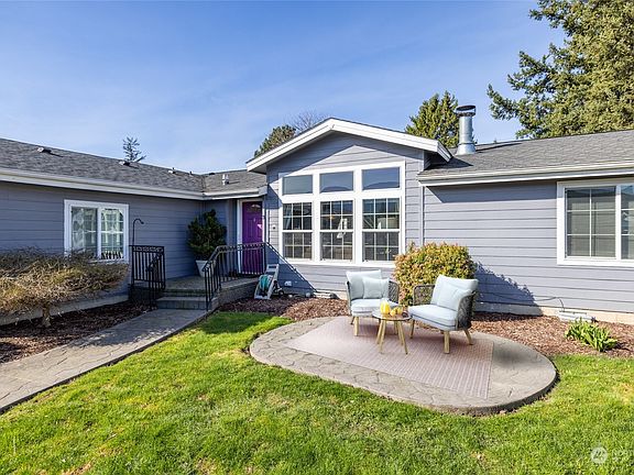 Discover the charm & quiet of Sumas River Estates in Everson. This 3-bed, 2-bath home offers an open living space, abundant natural light, and a wood-burning fireplace. The primary suite features a spa-like bathroom and walk-in closet, while the dining room opens onto a private back deck. The functional floor plan separates the sleeping space to separate ends of the house. Freshly painted in 2019, new hot water heater in 2024, this home has been gently lived in and well maintained. Located in a gated 55+ community is close to restaurants, parks, and schools. Embrace a tranquil lifestyle in this inviting home.