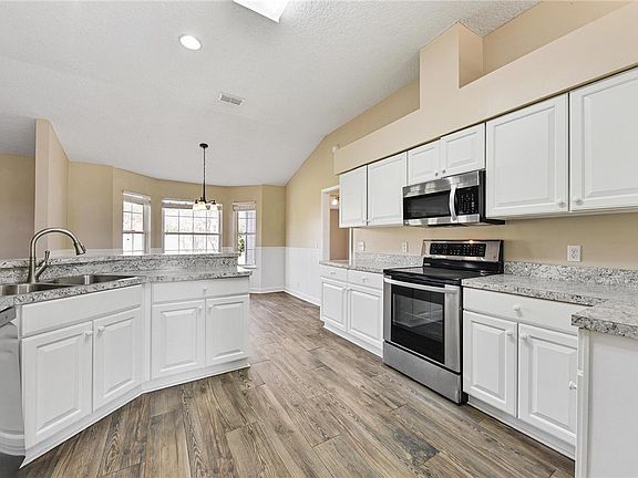 This thoughtfully designed 4-bedroom home features a split floor plan that ensures privacy, with the owner's bedroom secluded from the guest quarters. Inside, the charm begins at the foyer entry and extends throughout the home, with wood grain tile floors lending warmth and durability. A formal dining room, adorned with chair rail and large picture window sets the stage for a full dining set. The heart of the home is the spacious kitchen that's open to the great room, complete with a breakfast bar and a cozy breakfast nook highlighted by charming beadboard accents. Guest bedrooms have ample closet space, with a shared hall bath also with bead board accents. One guest bedroom offers a delightful window seat with storage and a walk-in closet. The owner's bedroom is a sanctuary, featuring a tray ceiling and a spa-like bath with a jetted tub, double sinks, water closet, and a remodeled shower adorned with trendy hexagon tiles. The interior laundry room is conveniently located as a mudroom to the 2 car attached garage. Outside, the back patio, illuminated with surrounding lights, overlooks the fenced back yard, perfect for relaxing evenings or entertaining guests. Nestled in the Mill Creek community of Sugarmill Plantation, approximately 2 miles from NSB Kings Bay, residents enjoy the convenience of low HOA dues along with an array of amenities including a playground, tennis courts, picnic area, picturesque lakes, a recreation field, and an Olympic-sized community pool. This meticulously maintained home offers a harmonious blend of comfort, style, and functionality, presenting an irresistible opportunity for those seeking a place to call home. Seller currently has an under 3% interest rate, assumable VA Loan with NBKC