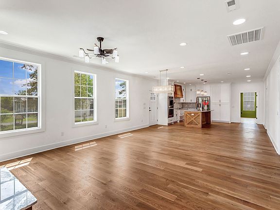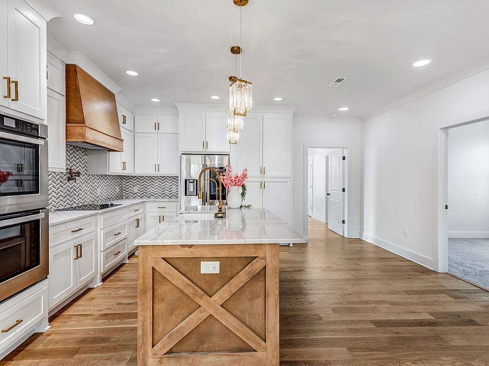 Custom finished closetsLarge islandPot fillerBuilt-in ovenOpen-concept layoutUnique light fixturePorcelain tile flooring