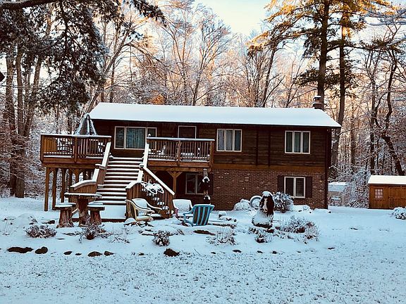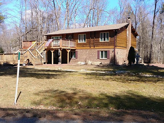 Perfectly Pocono real log home with Brazilian hardwood floors and Ceramic tile work, well maintained non smoking home has expansive wrap around deck for a relaxing view of landscaped corner lot. Property Constructed with all First class materials from tongue and groove cedar wood walls in family room to the knotty addler doors on second floor make this one of a kind.. Large outbuilding. Property lends itself for entertaining a large family or an exquisite rental. This property is located in a Conservation Community with lakes and beach. all Pocono sports and entertainment within 5 mile radius.