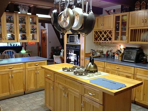 Expanded A-Frame with fantastic kitchen. Spacious living room, screened porch and a bath house out by the inground swimming pool. Huge garage with indoor RV parking and a bonus room above that could be a separate apartment. Second parcel, with small grape vineyard is included.