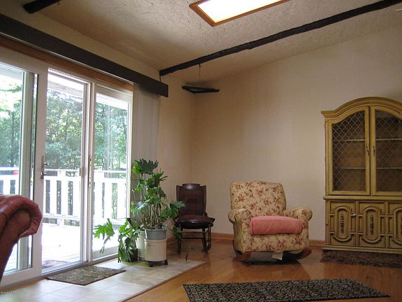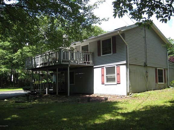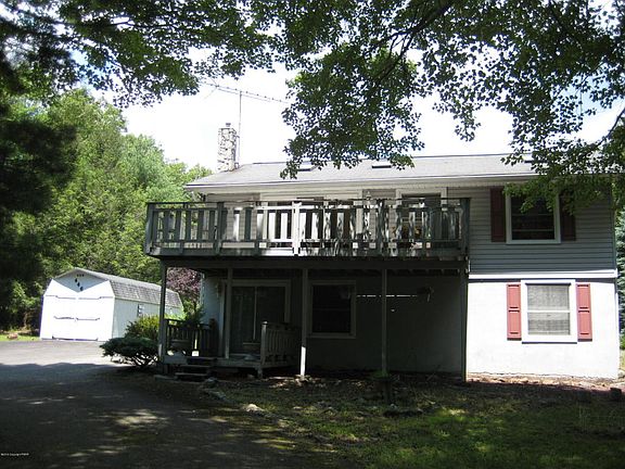 4 bedrooms, 2 full baths Raised ranch with paved circular driveway, large shed and a lot of privacy. House features living room with hardwood floors cathedral ceilings, skylights, access to over sized deck, dining area, kitchen, in a lower level family room with kerosene monitor heating unit, deck, utility room with washer and dryer, foyer, walking in closet. Property sits on a little over one acre of land in the community with low dues. Close access to PA Turnpike and many Pocono attractions.