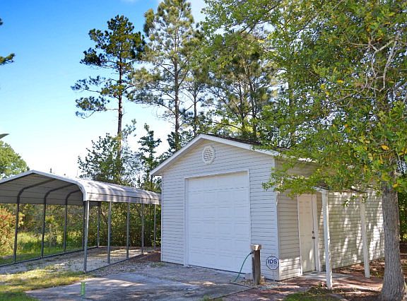 PRIVATE.House on over an acre with nice tree coverage.Covered Boat parking.Detached garage/workshop with power.Private back yard backs up to wooded area.Open floor plan with plenty of space.Solid surface floors everywhere but bedrooms.You can walk all the way around the house on paved walk way under 4 foot overhang.3 Bedroom/2 Bath.Tile shower in master.Large master will fit king size bedroom set.Other two bedrooms large.Detached garages/workshops with fish cleaning station.Plenty of room to park the boat. You really need to see this one. Home WarrantyLess than 10 minutes to Kings Bay Navy base. Quick easy access to I-95 and only 20 minutes from shopping in Jacksonville or Brunswick. Enjoy living in a small coas