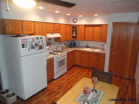 NICELY UPDATED RANCH HOME on quiet street in East Dubuque! 3 bedrooms, 1 bathroom and an oversized 1 car attached garage. Features oak cabinets in kitchen, spacious deck, new laminate flooring thru kitchen, living room and hallway, mostly new windows, wood fireplace in lower level family room, all appliances remain and more!! MUST SEE!!