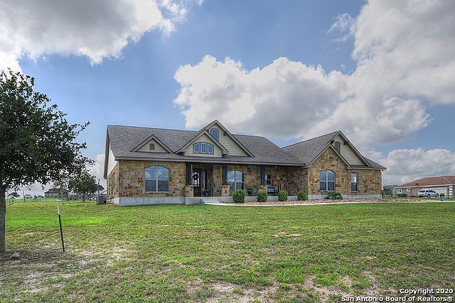 Built in 2013, this gorgeous La Vernia estate is full of custom details, showcasing meticulous craftsmanship. Set atop approximately 3.21 fenced and cross fenced acres, this residence beautifully combines the serenity of country living with a modern design. This single story provides ceramic tile, hardwood, and carpet floors, four bedrooms, two and one-half baths, plus a private study. Abundant natural light illuminates the home and accents the formal dining area and entryway which immediately greets guests beneath tray ceilings. These spaces flows seamlessly into the open-concept living area with floor-to-ceiling stone fireplace, dual tray ceiling, and wall of windows overlooking the back yard. A stunning kitchen features rich custom cabinetry with task lighting, built-in stainless steel appliances, granite counters, island workspace, large breakfast bar, plus adjacent casual dining area with bay windows. A large laundry room with granite counters and sink plus adjacent drop zone create ample space for organization plus a central vac system for easy cleanup. Each bathroom offers granite counters and the spa-like master bath includes a soaking tub, dual vanities, and spacious shower. Enjoy wide-open spaces and cool Texas nights relaxed atop the east-facing back patio with fireplace. Homeowners will appreciate the three-car garage with insulated doors, and this animal-friendly property also includes a three-stall horse barn plus attached tack room with water, electricity, and fans. Without a H.O.A., this land affords you plenty of space to explore your passions.
