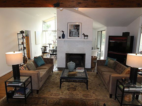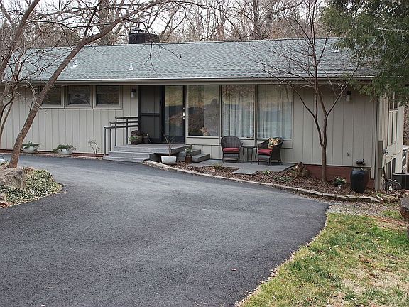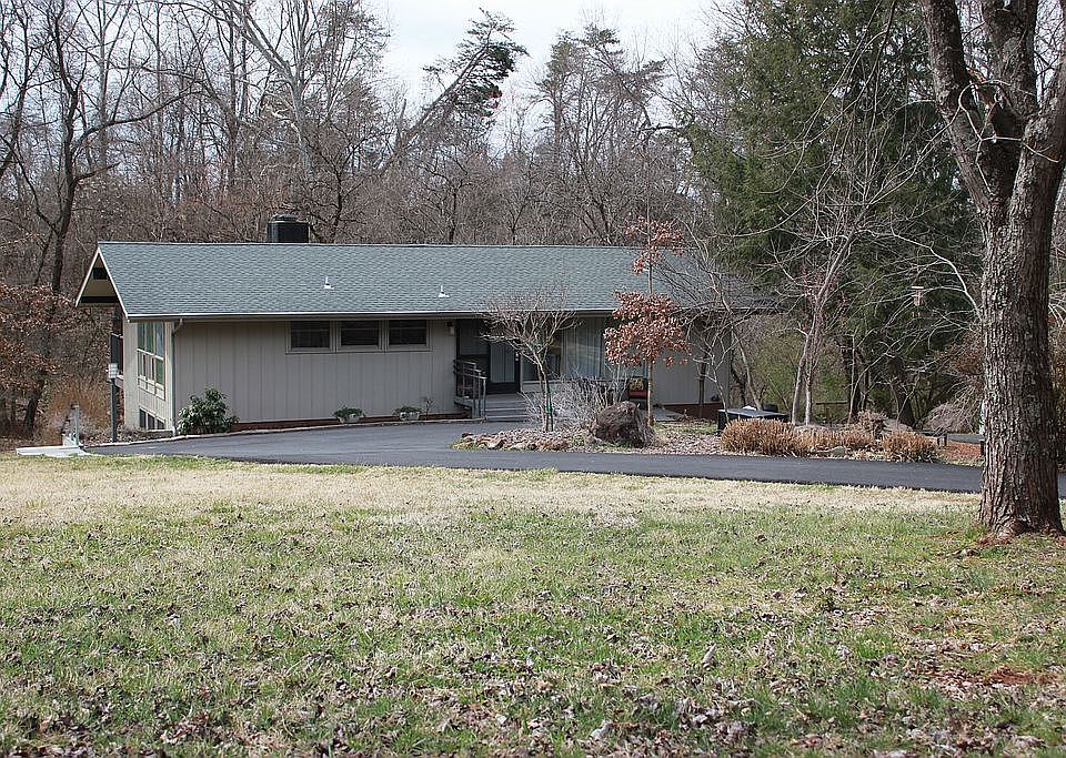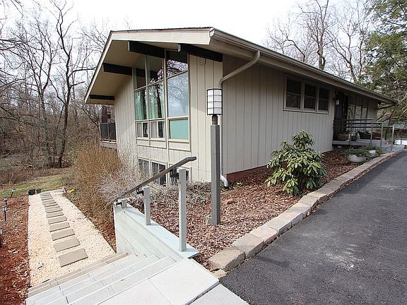 For lovers of Mid-century inspired modernism, this unique California TechBuilt house may seem deceptively modest from the road, but step inside and feel immediately surprised by the brightly lit vaulted interior with its huge, open-concept living/dining/working area and cathedral windows. A bank of sliding glass doors opens onto an expansive and welcoming three-season sunroom. Another set of large sliding glass doors opens onto a deck off the dining area -- overlooking the backyard with its winding creek and woodlands beyond. The main level also features a first-floor master bedroom that boasts a second, private deck. There are separate his & her bathrooms on the main floor, as well as an appealing and efficient kitchen with adjoining pantry area. The lower-level is currently configured with an additional bedroom, office (which could be another bedroom), hallway library, laundry & large storage room. The other half of the lower level is currently a separate rental / guest apartment with its own bedroom, kitchen, living room, bathroom, sunroom, terrace and private entrance. This furnished apartment generates $1,250 per month in rental income. The apartment furnishings convey. Also on the lower level, there is also a dual interior & exterior studio/shop area for an artist, craftsperson or woodworker, with an adjacent driveway. Recent appliances, roof, HVAC, new asphalt driveway, and many other updates and renovations throughout the house. The property is located in a friendly HOA-free neighborhood that offers residents a swimming pool, tennis courts, and riverside walking trail to Key West Club members. For those who love to be on the river, there is kayak/tubing access which allows a relaxing drift to Darden-Towe Park (which also offers a dog park, tennis, baseball, soccer and more area hiking just two miles away).