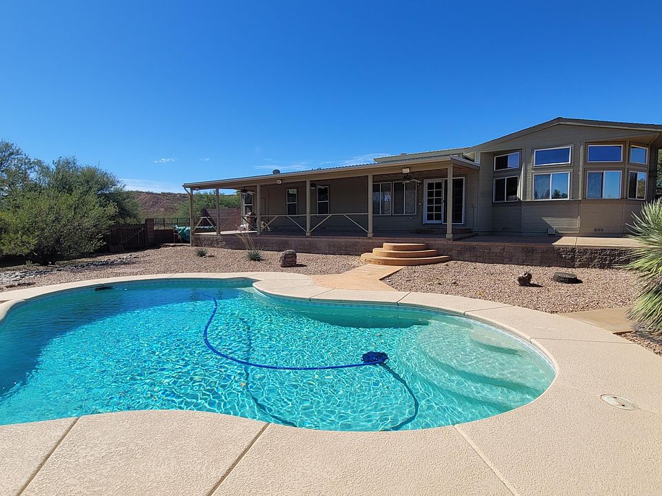 Exquisite, energy efficient, spacious 4bdrm, 2ba on 5+/- fenced acres! Relaxing, entertaining living in this flexible floor plan is ready for any occasion. Spacious rooms, his & hers closets in Master Suite, luxurious master bath, soothing fireplace, cooks delight kitchen, island, walk-in pantry. Oversized 3 car garage, plus separate 2 car garage w/half bath. RV carport with RV service. Inviting sparkling pool with water feature. All this and more in the security and seclusion of a gated community. Gorgeous views!