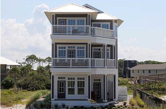 Premiere Ovation, GULF FRONT HOME, X flood zone. As you enter this 2014 newly constructed, fully furnished home, you are greeted with coastal wood slat walls, built-in bunks, a separate bathroom & living space, all opening to the outdoor decks, outdoor shower & pavered boardwalks. The 2nd floor features open living, dining, & kitchen which has upgraded stainless appliances, including double oven & separate ice maker. Enjoy views from every room including, the covered deck entertaining space. This floor also includes a bathroom & guest bedroom with bay view balconies. The 3rd floor has two gulf front suites. The master has beautifully appointed interiors & the serene master bath features custom cabinets, walk in closets, separate soaking tub & exquisite tiled shower surrounded with glass and high end fixtures. High rental potential.