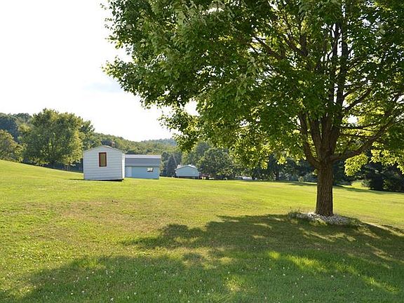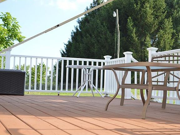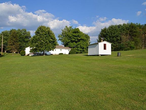 Peaceful country living! This home is nestled on a flat acre with gorgeous views... You're sure to appreciate one-level living in this 3 bedroom ranch. Many improvements have been made throughout! The new bathroom features ceramic tile floor, a new vanity and commode. The updated eat-in-kitchen has been freshly painted and has neutral countertops, a backsplash, and knobs that showcase the wood cabinets that are in great condition! The largest bedroom has a dividing wall that makes an ideal bedroom for siblings wanting their own space or this could become a Master with a sitting area that is captive. The 3rd bedroom gives access to master bedroom. There is plenty of space to add a 2nd full bath on the lower level. Outdoors, the freshly stained deck with the Sunsetter awning is sure to be a favored gathering place to enjoy the sunsets and mature shade trees. The breezeway with new flooring has access to the front and rear patios. Tinker away in the garage. With a little elbow grease and minimal cost, transform the open basement into your own space!