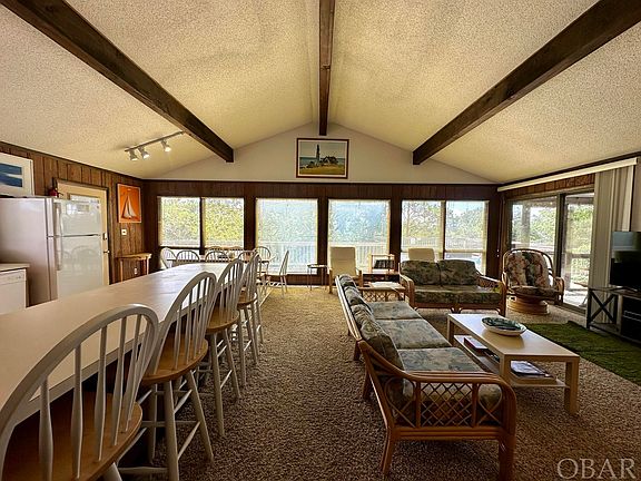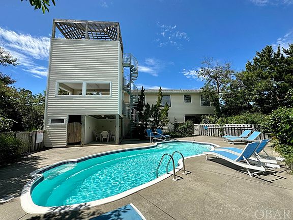 Located in the desirable Carolina Dunes subdivision of Duck, this adorable cottage has so much to offer. Perched on a high dune, this home provides plenty of outdoor living spaces and a bright and cozy living area. The ground level offers a pool with a large outdoor shower and a covered dining area. Enjoy the hot tub located on screened-in porch off the main living area, making up over 1,000 sq. ft. of decking. Continue to the observation tower, where you will find panoramic views of the ocean and the sound to view beautiful sunrises and sunsets. Upon entering the home, you will find a spacious open floor plan with a ton of natural light with oversized windows. Large kitchen with plenty of cabinet space and storage. This H floorplan house offers ample space for personal enjoyment and guests. The home's location is a short walk to the Carolina Dunes community beach access and sound front access with a pier and gazebo. Easy access to the bike path for a short walk or bike ride to restaurants and shops. Ideal for a rental property, second home, or primary residence. Updates in 2023 include: Fortified roof, heat pump with Nest thermostat, and new paint in kitchen and living room. The building has a deep well suitable for the installation of a Geothermal heating and cooling system, as well as a lightning protection system.
