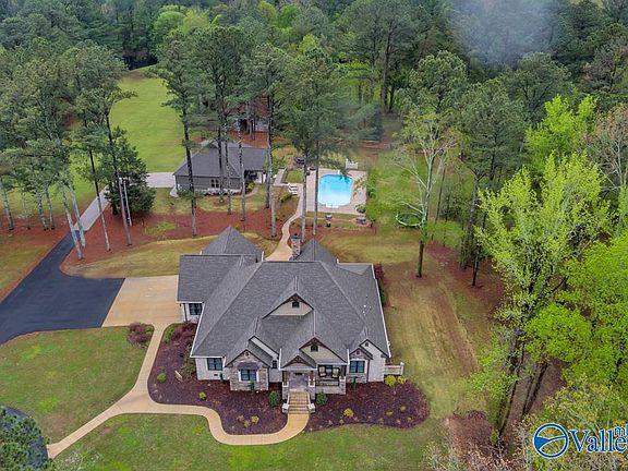 Custom built 3 bedroom 4.5 bath home w/bonus on 10.90 acres! Youre welcomed by the spacious living room featuring a stone gas log fireplace & 18' vaulted ceilings! The kitchen features custom cabinets, large butlers pantry, Kitchenaid appliances, quartz countertops & more! The cozy master suite features a huge walk-in closet with built-in shelving, a master bath with soaker tub & separate walk in tile shower! This property also includes a 1017 sqft guest house with an attached 3 car garage! Perfect for multigenerational family or rental! Enjoy the view of the gorgeous backyard & pool from the large covered back porch! Barn has electric & water with 4 stalls. 30 min to Decatur, 50 to HSV