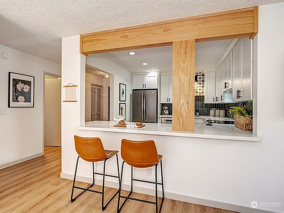 Welcome Home to this charming condo in the heart of downtown Edmonds. This tastefully renovated sanctuary is ideally located on the Top floor, corner, boasting peace and privacy w/no adjoining walls. Spacious layout, 1,253 sq. ft, showcasing hardwood flooring throughout, gourmet kitchen, new SS apps, quartz counters & shaker cabinets.The 2 bedrooms offer ample space, complemented by quartz & tile bathrm, plus a generous walk-in laundry. Entertain in the spacious living and dining areas, complete w/cozy fireplc for chilly evenings or slide open the deck door to breathe in crisp coastal air.Convenient stroll to boutiques, eateries, theater & beaches. Amenities: Lounge, Party Rm & Exercise Rm, secure entry, elevator, parking & strg.Come Enjoy!