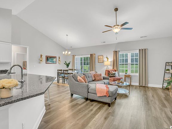 Sipping your morning coffee as you watch golfers or a family of deer - living directly on the golf course allows for quiet entertainment whether it be golfers or nature! This lovely home features a split bedroom floor plan, a spacious kitchen with an oversized breakfast bar along with ample cabinets and a pantry! The kitchen features granite counters and stainless appliances. The open concept living and dining area provides spacious living! LVP flooring throughout the living and dining area exudes style while providing easy care! The double garage provides ample room for parking and unloading easily into the kitchen area. This home is on the 14th hole tee box of the Wedgefield Plantation golf course; you will enjoy peace and serenity in this private location. Across from the pond, behind the house, is the 11th hole green - an amazing view all the time from your living room, primary suite, or back patio! Or, enjoy sitting on your front porch - there is plenty of room for rocking chairs or a swing! Don't miss your opportunity to live the quintessential southern lifestyle in Georgetown!