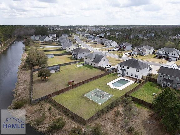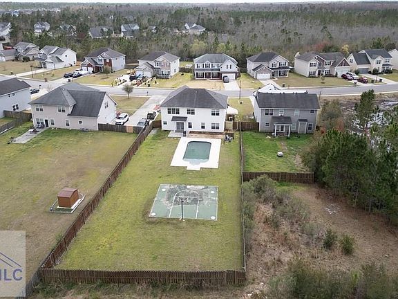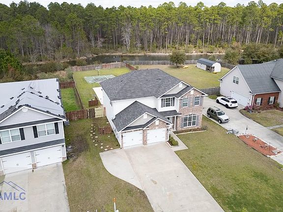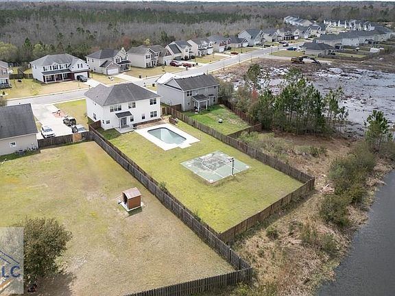 Welcome to this spacious 5-bedroom, 3-bathroom home located in the Villages on Marne community, just minutes from Fort Stewart. Featuring a formal dining room and a versatile flex room perfect for an office or sitting area, this home offers flexible living spaces to suit your needs. The main level includes a bedroom and a full bathroom, while the second floor boasts a luxurious primary suite with a private en-suite bathroom featuring a shower, soaker tub, dual vanities, and a walk-in closet. Four additional bedrooms, a full bathroom, and a convenient laundry room are also located upstairs. Step outside to the covered back porch and expansive fenced yard, providing privacy for your in-ground saltwater pool and half basketball court, ideal for outdoor entertaining. Behind the fence, you'll discover access to a tranquil lagoon stocked with fish—perfect for relaxation and outdoor activities. This home offers the perfect balance of comfort and outdoor enjoyment!